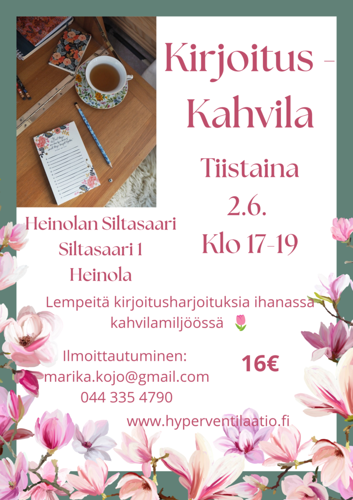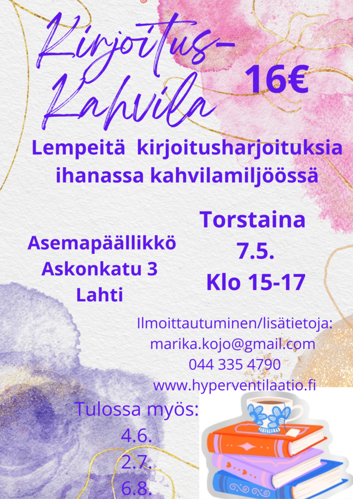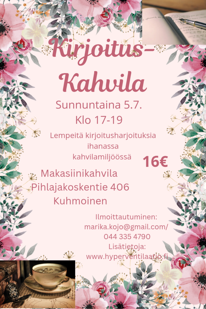 HUOM! Jokainen Kirjoitus-Kahvila on oma kokonaisuutensa, teemme joka kerralla eri harjoituksia. Voit osallistua siis vain yhteen tai ilmoittautua vaikkapa kaikkiin.